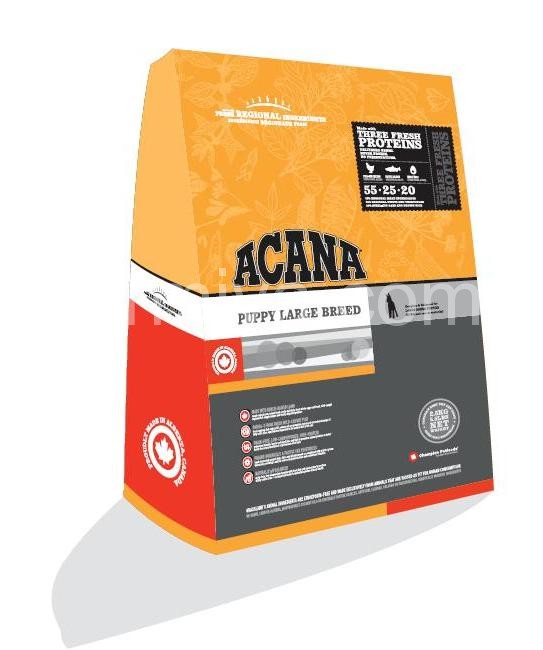 Kompletní krmivo pro štěňata velkých plemen Štenata velkých plemen vyžadují specicky vyváženou stravu s vysokým obsahem proteinu podporujících svalstvo a s nízkým obsahem sacharidu. Tento faktor pomáhá regulovat hmotnost a prispívá k optimálnímu vývoji kostry. Proto je každá granule ACANA PUPPY LARGE BREED doslova nabita proteiny z prvotřídních masových přísad (55 %) zahrnujících volně chovaná kuřata, vejce z prérijních farem a lososy ze studených vod Tichého oceánu u Vancouver Island. Tyto suroviny se DENNE DODÁVAJÍ CERSTVÉ zásadně tedy nejsou mražené a neobsahují konzervační prostředky. Krmivo ACANA obsahuje více proteinů a méně sacharidů. ACANA dále neobsahuje pšenici, kukuřici a lepek, jež často způsobují poruchy zažívání, a vyznačuje se celými 20% zdravými druhy ovoce a zeleniny a řezaným ovsem z Alberty – sacharidy s nízkým glykemickým indexem, které zabraňují nevhodnému nárůstu váhy štěňat. Čerstvý losos je vynikajícím zdrojem omega-3 (EPA, DHA). Tyto nenasycené mastné kyseliny zvyšují imunitu a zlepšují srst. Organické chaluhy a prérijní byliny, včetně listů maliníku a mléče bylinného, jsou přírodním zdrojem antioxidantů a fytoživin vyživujících celé tělo. Vápník, fosfor a glukosamin pocházejí z přírodního zdroje a vyvažují stravu velkých plemen. Krmivo světové úrovně ACANA se vyrábí z nejlepších a nejčerstvějších kanadských surovin v oceněné rodinné továrně nacházející se v Albertě. Když si prostudujete jednotlivé přísady, určitě nám dáte za pravdu – ACANA PUPPY LARGE je lahodný přírodní výrobek, díky němuž bude vaše štěně zdravé a silné. ZARUCENÁ ANALÝZA Dusíkaté látky................. 33 % Tuk ................................ 15 % Vlhkost .......................... 10 % Popel .............................. 7 % Vláknina ....................... 3,5 % Vápník........................... 1,2 % Fosfor............................ 1,1 % Omega-6....................... 2,5 % Omega-3....................... 0,4 % Glukosaminu..........800 mg/kg Chondroitinu...........500 mg/kg OBSAH ROSTLINNÝCH SLOŽEK Kořen lopuchu........600 mg/kg Kořen ibišku ...........600 mg/kg Bobule jalovce obecného 500 mg/kg Kořen anděliky .......400 mg/kg Kopřiva dvoudomá.400 mg/kg Rakytník úzkolistý...400 mg/kg Listy maliníku obecného 300 mg/kg Ostropestřec mariánský 300 mg/kg Složení: Dehydrované kuřecí maso (40%), oves, čerstvé kuřecí maso, hrách, čerstvý losos, kuřecí tuk (přírodně konzervován směsí tokoferolů a rozmarýnu), kuřecí játra, čerstvá celá vejce, vojtěška setá, lososí olej, tykev, kuřecí chrupavky, jablka, mrkev, mladé lístky tuřínu, brusinky, bobule oskeruše, ekologicky pěstované mořské rostliny (chaluha, řasa měchýřnatá, mořská řasa dulse), koř. lopuchu, koř. ibišku, bobule jalovce obecného, pískavice řecké seno, fenykl sladký, kořen anděliky lékařské, rakytník úzkolistý, kořen čekanky, kopřiva dvoudomá, listy maliníku obecného, ostropestřec mariánský, lístky máty peprné, květy měsíčku lékařského, květy heřmánku lékařského, enterococcus faecium, lactobacillus acidophilus + vitamíny a minerály. Obsah kalorií: Energie představuje 3950 kcal/kg, 38% energie pochází z proteinů, 32% energie z tuků a 30% energie z ovoce, zeleniny a řezaného ovsa.